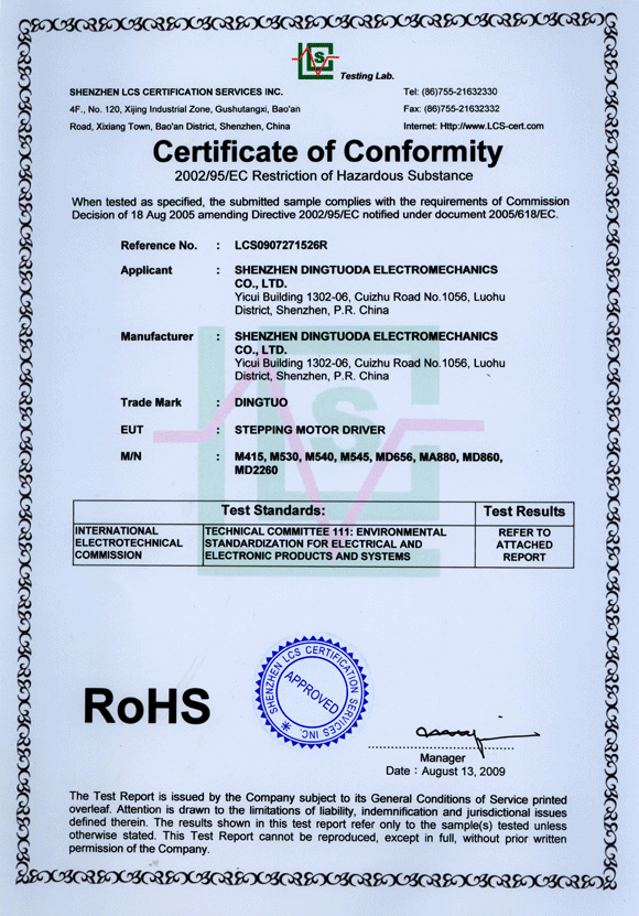 首頁->產(chǎn)品認證->步進驅動器RoHS認證證書